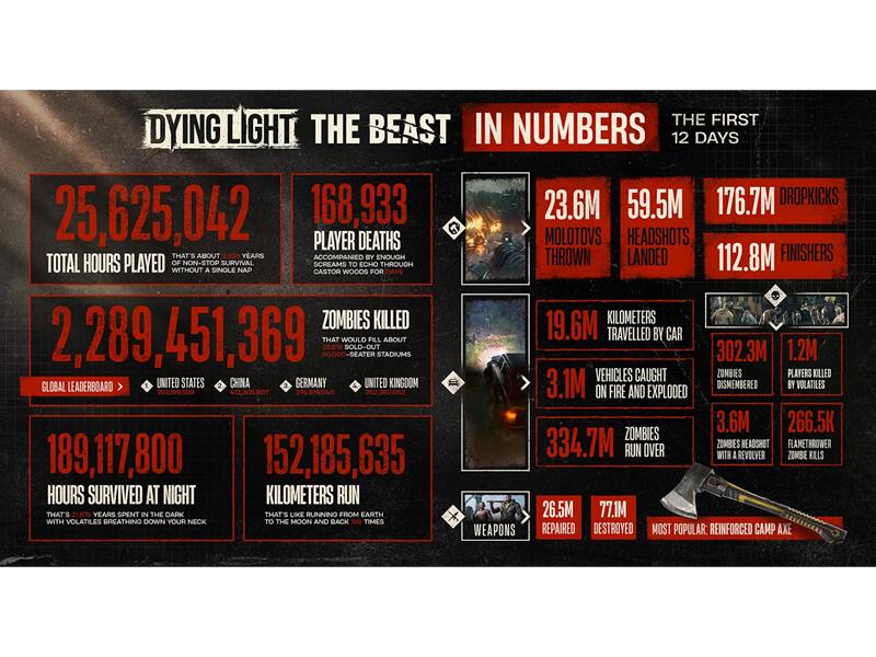 We’d like to share some exciting player stats from the first 12 days since the launch of Dying Light: The Beast. Players have spent countless hours in the game, eliminated hordes of zombies, run hundreds of kilometers, and. .. sent numerous cars up in flames! And this is only the beginning - more and more players are joining Dying Light: The Beast every day.