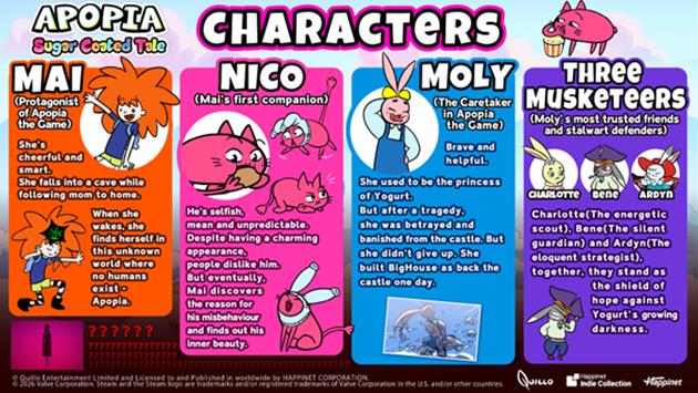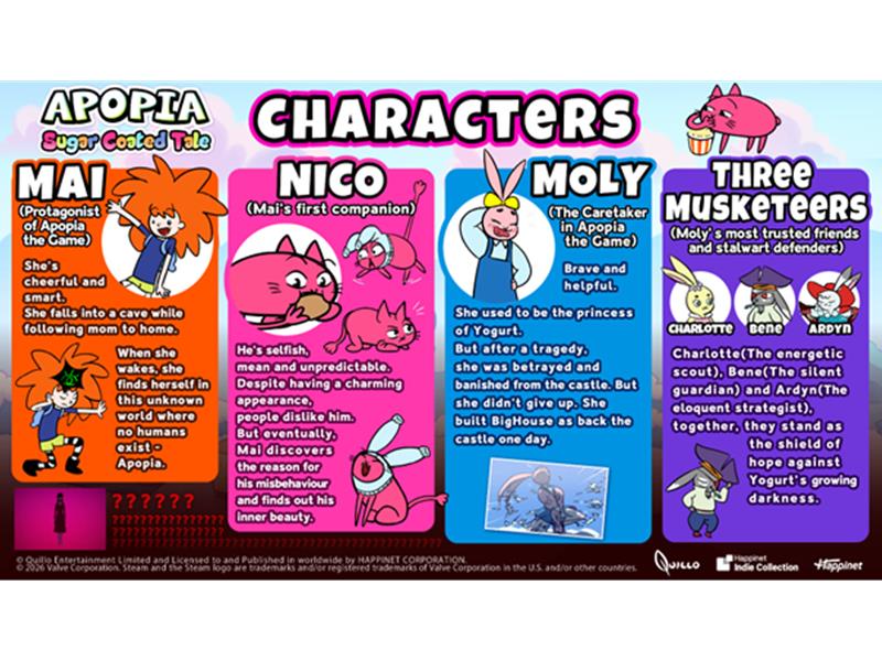 Independent publisher Happinet is pleased to share that Quillo Entertainment's story-rich adventure title Apopia: Sugar Coated Tale is available for purchase now on PC via Steam for an MSRP of $14.99, €14.79, and £12.79. To celebrate the launch, Happinet is offering a 10% discount on the title through March 9. Additionally, fans will be able to purchase the game’s whimsical original soundtrack on Steam separately for $3.99 starting March 12.