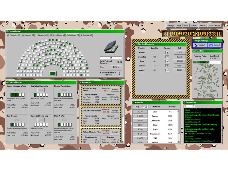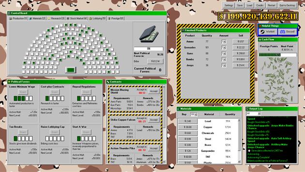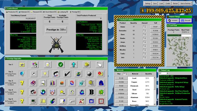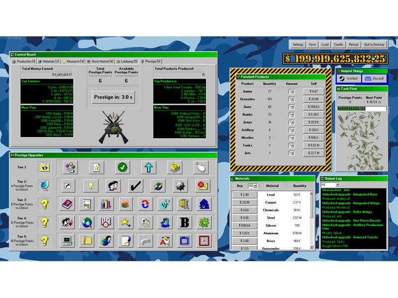What are you waiting for? These weapons aren’t going to make themselves! In Military Incremental Complex, greediness is not only welcomed but a virtue. Become the most masterful arms dealer on the planet, making trillions solely from just the click of your mouse! Exploit global markets, manipulate economies, and monopolize companies to bring in that dough! Purchase materials to craft from the smallest handmade bullets and grenades to more advanced weaponized machinery, such as tanks, jets, and even nukes! Streamline your production, hiring more scientists and interns, and buying out mines and refineries, creating your own supply chain. Automate all weapons production to keep a steady incoming cash flow, and then sit back, light up a cigar, and watch your capital rise to the ultimate pinnacle of wealth.
