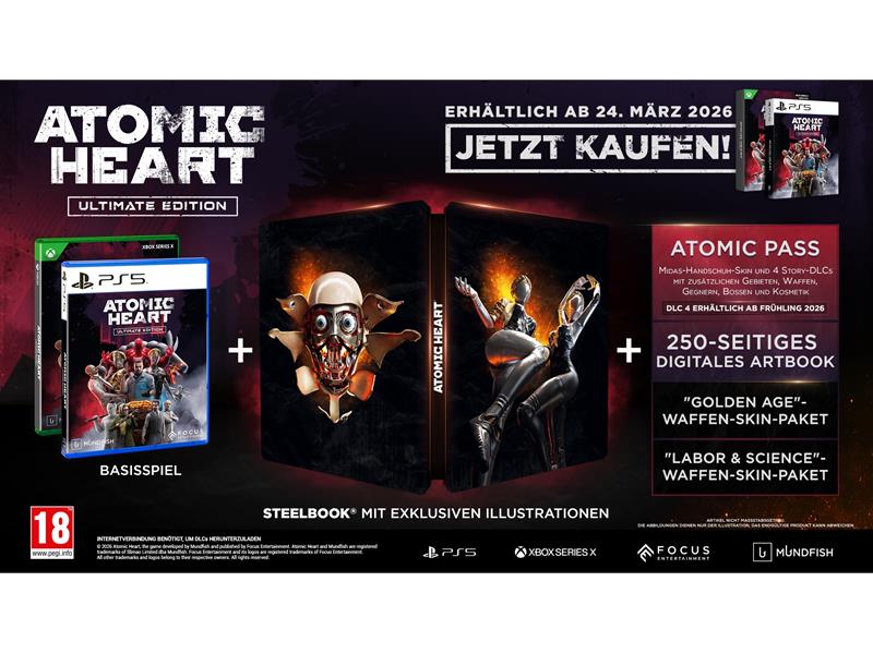 Neben der Veröffentlichung von DLC #4 Blood on Crystal erscheint in diesem Frühjahr auch die neue Ultimate Edition von Atomic Heart im Einzelhandel und in digitalen Stores. Die limitierte physische Edition mit einem neuen, exklusiven SteelBook kann bereits bei teilnehmenden Händlern vorbestellt werden und erscheint am 24. März. Die digitalen Versionen werden am 16. April mit der Veröffentlichung von Blood on Crystal erhältlich sein.