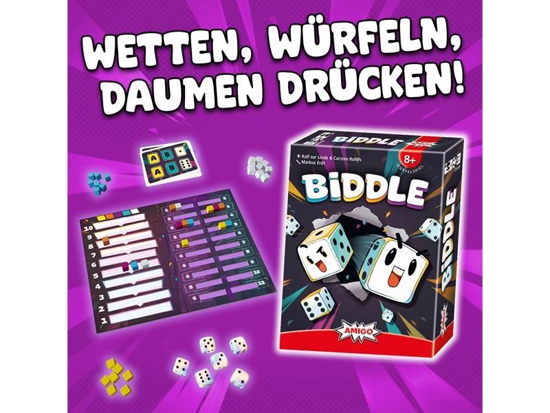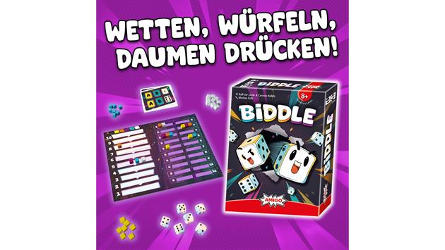 Bei Biddle unterbieten sich die Spielenden gegenseitig und wetten darauf, ob und mit wie vielen Würfen die gestellte Aufgabe gelöst werden kann. Wer am niedrigsten geboten hat, würfelt und versucht, die Punkte einzusammeln. Aber Vorsicht, es gibt immer jemanden, der dagegen gewettet hat!