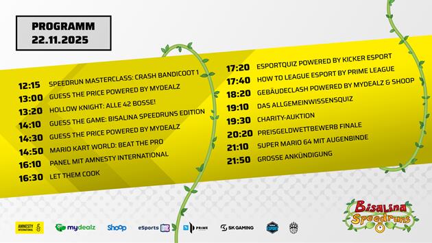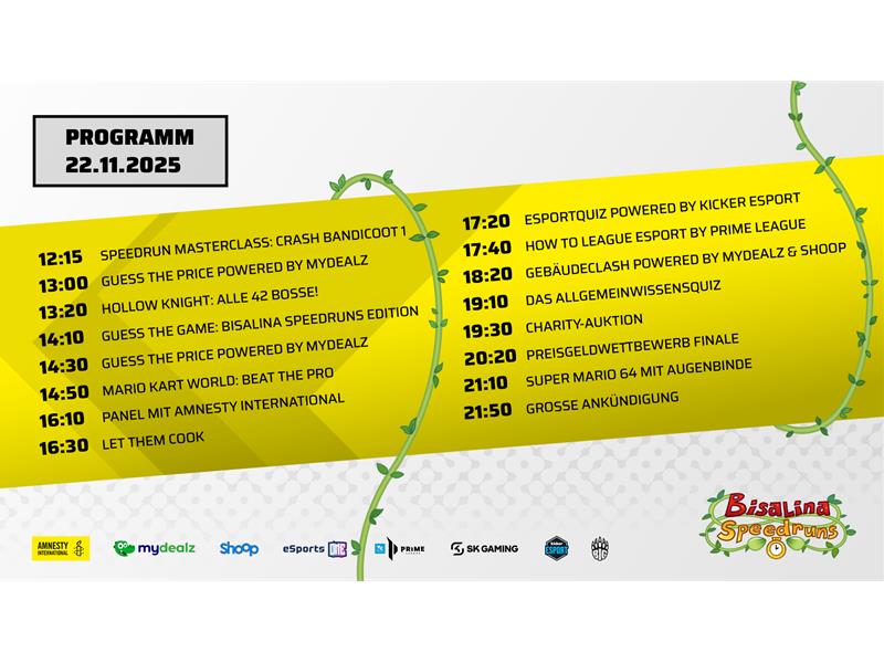 Sportdigital sowie auf YouTube und Twitch übertragen. Zusätzlich wird es auf über 30 Creatorkanälen gestreamt, darunter von Verena, Felikah und Vicotryona. Das Programm reicht von Speedruns über Formate wie Guess the Game bis zum E-Sport-Quiz und einem Panel mit Amnesty International e.V. Das große Finale bilden der Preisgeldwettbewerb und die Charity-Auktion zugunsten von Amnesty International e.V. Bereits jetzt gab es dafür mehr als 1.000 Einreichungen.