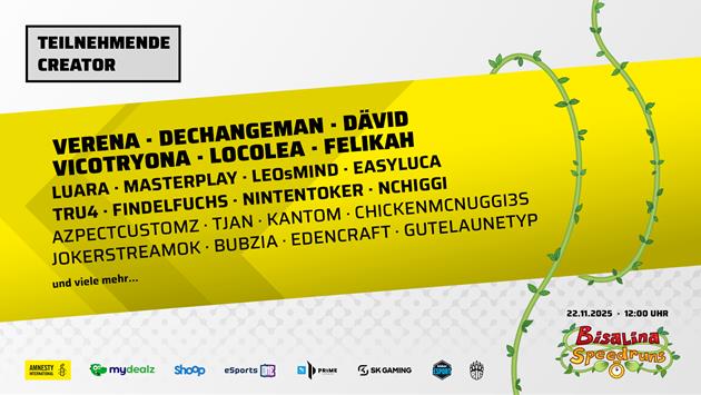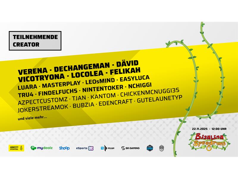 Mit hohem politischem Besuch und über 120 bestätigten B2B-Gästen wird Bisalina Speedruns 2025 am 22. November zu einem starken Jahresabschluss für die deutschsprachige Gaming-Community. In der Networking Lounge powered by mydealz und Shoop können sich Gäste austauschen, während Turniere und Aktionen live den Streaming-Content beeinflussen. Aus der Politik besucht der Minister für Bundes- und Europaangelegenheiten, Internationales sowie Medien des Landes Nordrhein-Westfalen, Nathanael Liminski, das Charity-Event und wird dabei sein Können in Mario Kart unter Beweis stellen