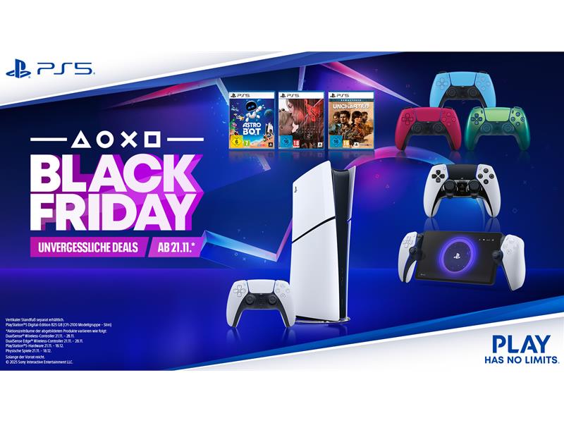 Ab heute bis zum 18. Dezember sind PlayStation 5-Konsolen, diverses PS5-Zubehör sowie eine Vielzahl an Spielen bei ausgewählten Handelspartnern, im PlayStation Store sowie bei direct.playstation.com im Rahmen der Black Friday-Aktionswochen zu stark reduzierten Preisen verfügbar.*