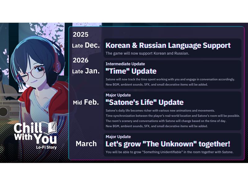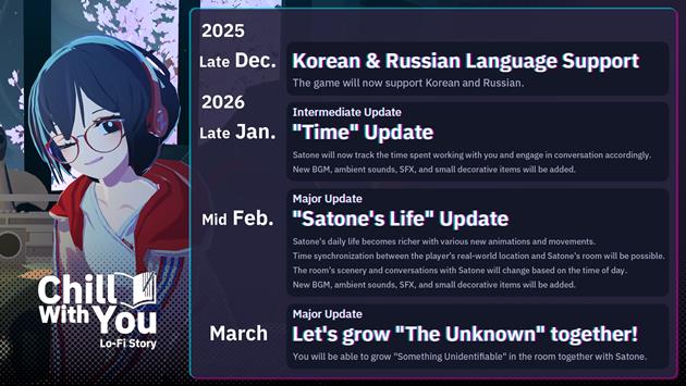 Late January 2026: “Time Update” - Satone will start to notice the amount of time spent working with you and converse accordingly. New BGM ambient sounds, sound effects, and accessories will also be added.