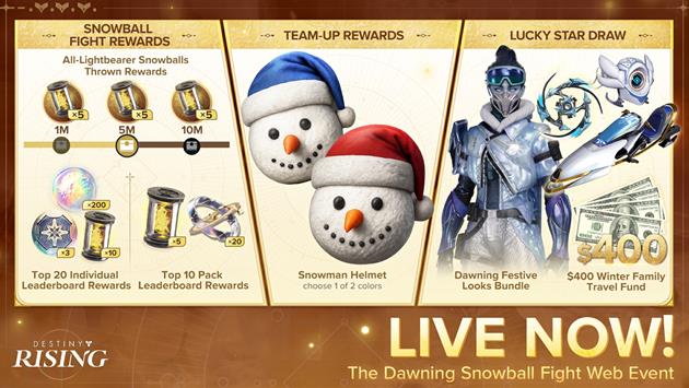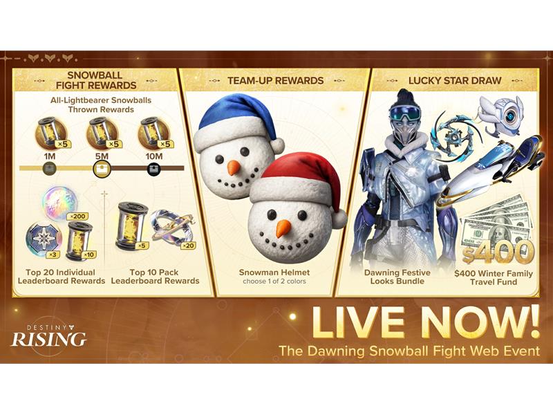 Limited-Time Gameplay and Cosmetics arrive for The Dawning. During the event period, players can engage in snowball fights within two special winter activities: "Snowball Showdown" and "Speedway Skirmish." A series of exclusive cosmetics themed around The Dawning season will be released, including Umeko's new skin, a Ghost Shell, and Sparrow!