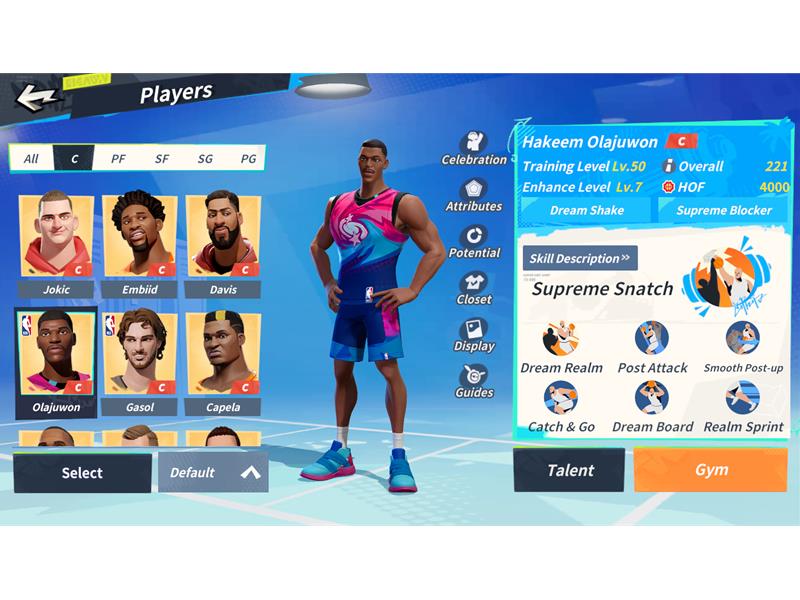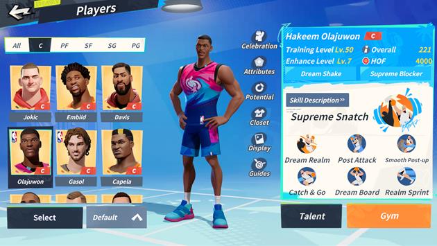 Positioned as a center, he excels in rebounding and shot-blocking while providing strong help defense. On offense, he is capable of creating mismatches and shaking off defenders, effectively alleviating pressure from the primary ball-handler. His ultimate skill “Supreme Snatch” allows Olajuwon to execute a one-handed block that secures possession of the ball with an increased block range and time window, while "Dream Realm" boosts his offensive abilities significantly for 5 seconds when he receives a pass or posts up within 5 meters of the basket. His skill “Dream Board” slightly enhances Olajuwon's rebounding competitiveness during attempts and increases his rebound range during Realm Sprint. He also possesses a variety of post moves, such as "Post Attack", "Smooth Post-up", and "Realm Sprint". These skills allow this Hall of Fame center to shine once again.