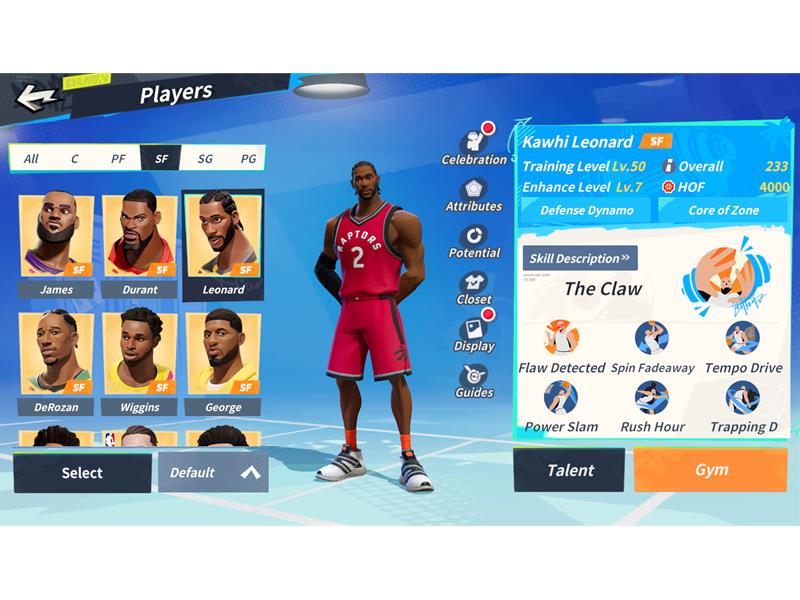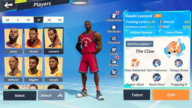 Positioned as a small forward, he primarily plays as a wing, excelling at defending opposing ball handlers while also possessing strong isolation scoring skills. His ultimate skill “The Claw” significantly enhances his ability to contest shots and triggers automatic steals at the right distance, while "Flaw Detected" allows him to observe opponents' dribbling and greatly increases his steal success rate just before they shoot. His skill “Rush Hour” allows Leonard to rush toward the ball handler even from more than 2 meters away without sprinting, while "Trapping D" slightly reduces his chances of being shaken off and increases his observation progress when opponents attempt to drive. His offensive skills such as “Tempo Drive,” “Power Slam,” and “Spin Fadeaway” ensure that he has a variety of offensive options, making him a versatile small forward capable of both offense and defense.