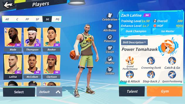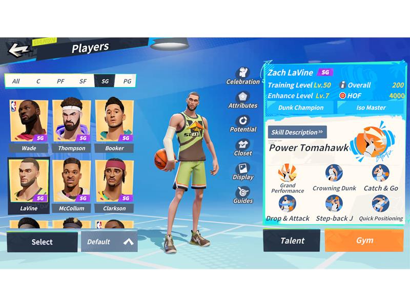 Positioned as a shooting guard, he is a well-rounded scorer with strong abilities in 3-point and mid-range shooting, as well as dunking. An expert in isolation plays, he thrives alongside big men who can shoot. His ultimate skill “Power Tomahawk” allows LaVine to execute a powerful one-handed dunk with a guaranteed poster dunk if unchallenged, while "Grand Performance" increases the speed of all his dunks and grants him advantages against defenders, stacking up to 3 times to reduce his contested range. His skill “Crowning Dunk” allows LaVine to finish with various dunking moves from different angles near the rim, including the BTL Reverse Dunk and Windmill from the sides, as well as the 360 Dunk and Windmill from the front. Other skills such as "Catch & Go," "Drop & Attack," and "Step-back J" ensure that LaVine maintains sufficient scoring power in both inside and outside offensive plays.