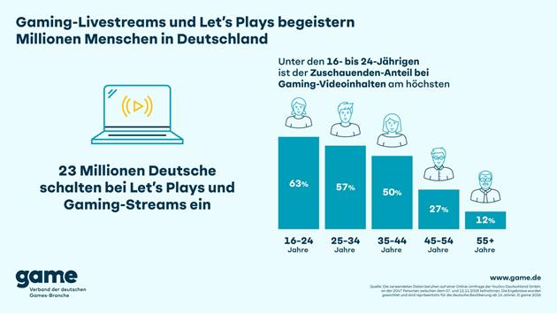 Gaming-Livestreams und Let’s Plays begeistern Millionen Menschen in Deutschland. Egal, ob man den Spielablauf der neuesten Titel erleben, sich Tipps zum Lieblingsspiel anschauen oder sich einfach gut unterhalten möchte. So schaltet jede beziehungsweise jeder Dritte ab 16 Jahren in Deutschland (32 Prozent) bei solchen Formaten zu Games auf Twitch, YouTube und Co. ein. Das entspricht rund 23 Millionen Menschen. Gaming-Livestreams und Let’s Plays verfolgen vor allem die 16- bis 24-Jährigen: Mehr als 6 von 10 von ihnen (63 Prozent) sind bei den Formaten als Zuschauende dabei.
