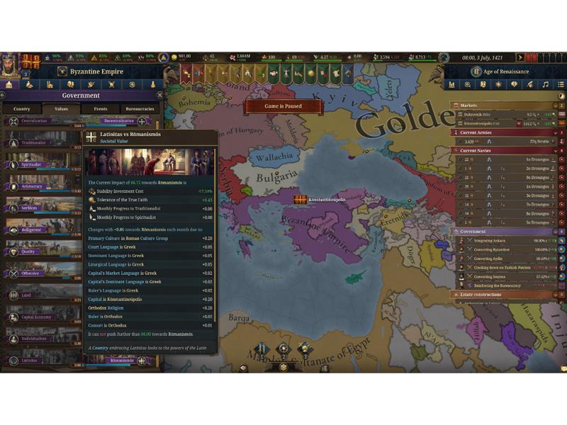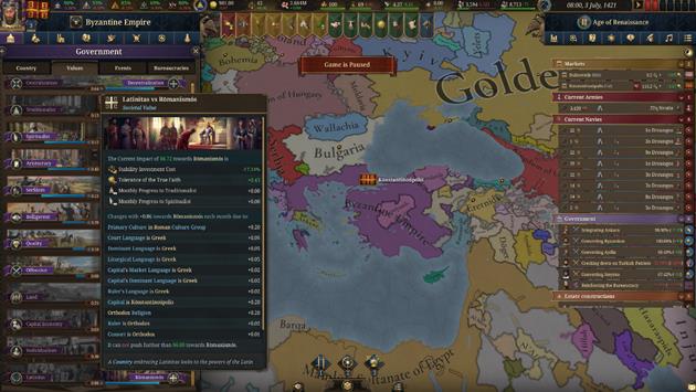 Latinitas vs Romanismos: A unique Societal Value for the empire, choosing between a reconciliation with the Latin powers of the west or entrenching Roman heritage.