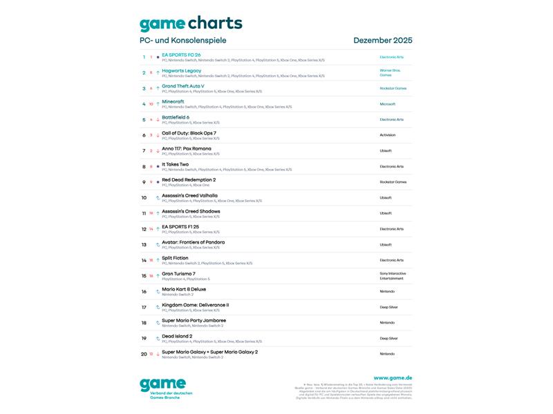 Die Top 10 der erfolgreichsten Games im Weihnachtsgeschäft runden ab: „Call of Duty: Black Ops 7“ (Activision) - die Fortsetzung der bekannten First-Person-Shooter-Reihe - auf Platz 6, die Aufbaustrategie „Anno 117: Pax Romana“ (Ubisoft) auf dem siebten Platz, das Koop-Abenteuer „It Takes Two“ (Electronic Arts), das Wild-West-Open-World-Spiel „Red Dead Redemption 2“ (Rockstar Games) sowie das Wikinger-Action-Adventure „Assassin’s Creed Valhalla“ (Ubisoft) auf den Plätzen 8, 9 und 10.