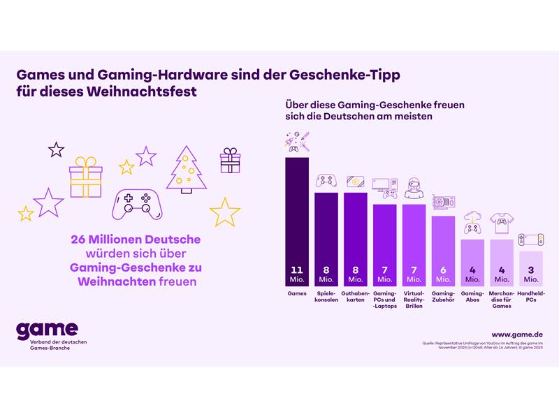 Gaming-Geschenke zu Weihnachten sind in diesem Jahr in Deutschland besonders beliebt. Ob Games, Spiele-Hardware oder Zubehör: 26 Millionen Deutsche über 16 Jahren (37 Prozent) würden sich darüber unter ihrem Weihnachtsbaum freuen. Das ist das Ergebnis einer repräsentativen Umfrage des game - Verband der deutschen Games-Branche in Zusammenarbeit mit dem Marktforschungsunternehmen YouGov.
