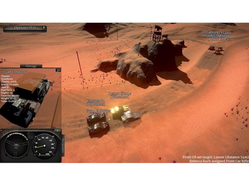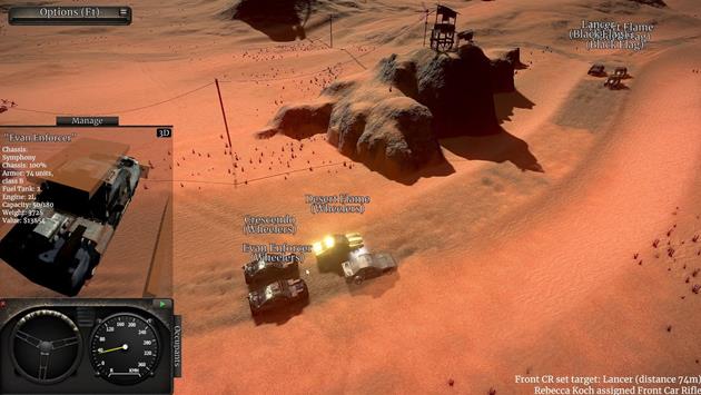 In combat, players control multiple vehicles and issue simultaneous orders while accounting for wheeled-vehicle momentum and terrain. Victory depends on understanding tyres, acceleration, surface types, cover, weapon recoil, and the armor layout of each vehicle