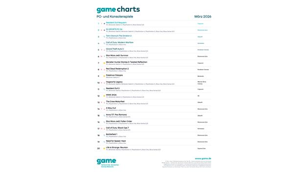 An der Spitze der Charts im März behauptet sich der Vormonatserste Resident Evil Requiem (Capcom).