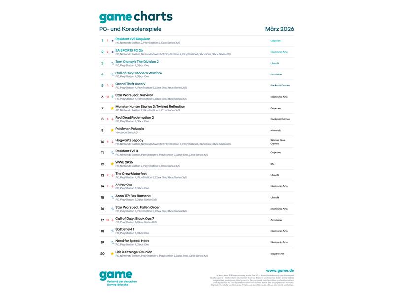 Vier neu erschienene Spieletitel haben im März direkt den Sprung in die offiziellen game Charts geschafft: Das Rollenspiel Monster Hunter Stories 3: Twisted Reflection (Capcom) steigt auf Platz 7 ein und lässt die Spielenden als sogenannte „Rider“ eigene Monster großziehen und an rundenbasierten Kämpfen teilnehmen. In die Top 10 auf dem neunten Platz schafft es das Lebenssimulation-Spiel Pokémon Pokopia (Nintendo), in dem man ein leeres Land in einen bunten Wohnort für zahlreiche Pokémon verwandelt.