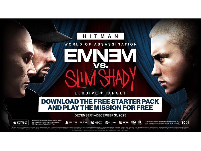 IO Interactive teilt heute mit, wie es Spielern in der neuen Elusive Target-Mission, Eminem vs. Slim Shady, bisher ergangenen ist. Die Mission ist kostenlos als Teil des Free Starter Pack und für Spieler von HITMAN WOA auf PlayStation 5, PlayStation®4, Xbox Series X|S, Xbox One, ROG Xbox Ally X, ROG Xbox Ally, PC, Nintendo Switch*, Nintendo Switch2*, iPhone, iPad und in VR auf PS VR2 und PC VR verfügbar. Das passende DLC-Pack ist ebenfalls für limitierte Zeit verfügbar und noch bis Ende der Mission am 31. Dezember erhältlich.