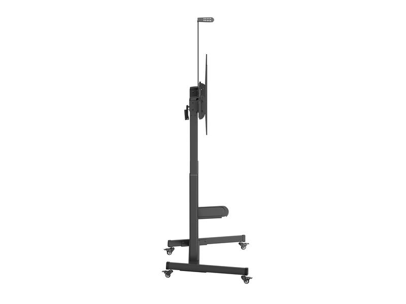 Der schwarze TV-Wagen fügt sich diskret in Büroumgebungen, Bildungseinrichtungen oder Veranstaltungsräume ein. Die Kombination aus Stahl und Kunststoffelementen schafft eine Balance zwischen Robustheit und Gewicht, die den Transport erleichtert, ohne die strukturelle Integrität zu gefährden. Ein Richtungsindikator unterstützt bei der Installation des Displays, während die werkzeuglose Neigungsfunktion schnelle Anpassungen ermöglicht.