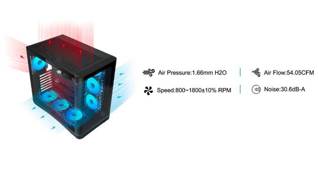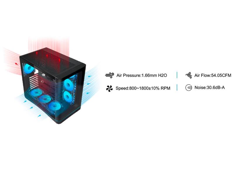 Sieben vorinstallierte ARGB-Lüfter sorgen für direkten Luftstrom und Beleuchtung, ohne dass zusätzliches Zubehör nötig ist. Jeder Lüfter hat einen Infinity-Mirror-Effekt, der für Tiefe und visuelle Bewegung sorgt und gleichzeitig ein klares, einheitliches Erscheinungsbild des gesamten Systems gewährleistet.
