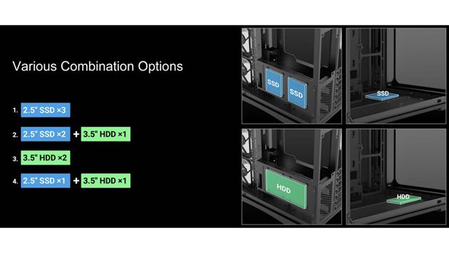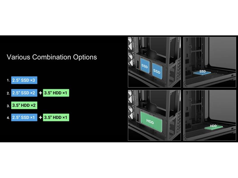 Der großzügige 95-mm-Kabelmanagementraum hinter dem Motherboard-Tray macht es einfacher, den Innenraum ordentlich zu halten, während die Unterstützung für bis zu zwei HDDs und drei SSDs praktischen Speicherplatz bietet, ohne den Innenraum zu überladen.