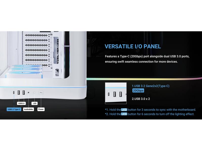 Entlang der Unterseite des Gehäuses sorgt ein integrierter ARGB-Lichtstreifen für einen dezenten Schimmer, der über das Gehäuse hinausgeht und das System auf dem Schreibtisch hervorhebt, ohne zu aufdringlich zu wirken.