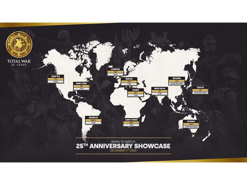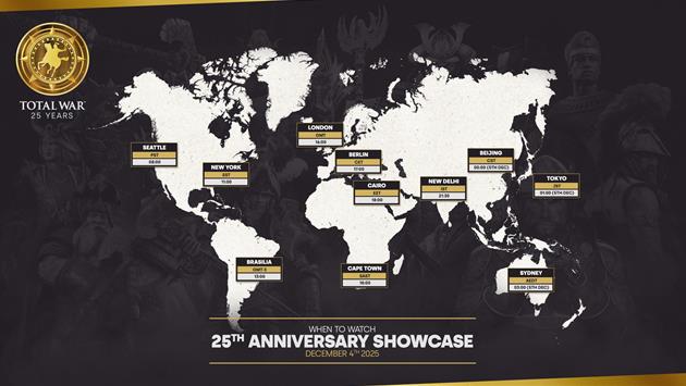 Das Total-War-Franchise tritt in eine aufregende neue Ära ein. Am 04. Dezember um 17:00 Uhr MEZ lädt Creative Assembly Fans auf der ganzen Welt ein, am Showcase zum 25. Jahrestag von Total War - einer speziellen Videopräsentation, die ein Vierteljahrhundert Strategiespiele feiert - teilzunehmen.
