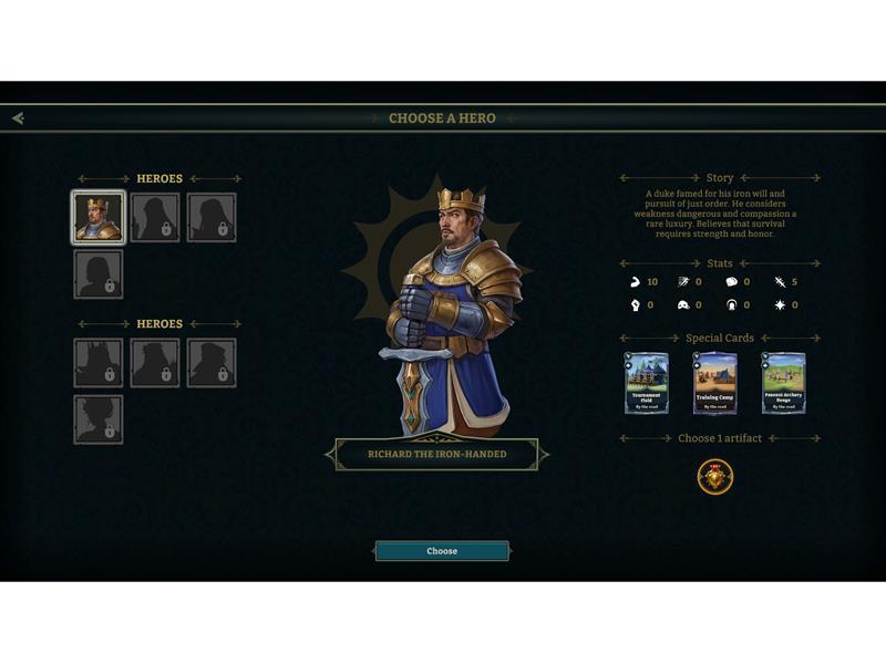 In the demo, players control one hero from the human faction, each with unique stats. With the card deck, players can try out kingdom building and look for synergies between buildings, resources, and artifacts.