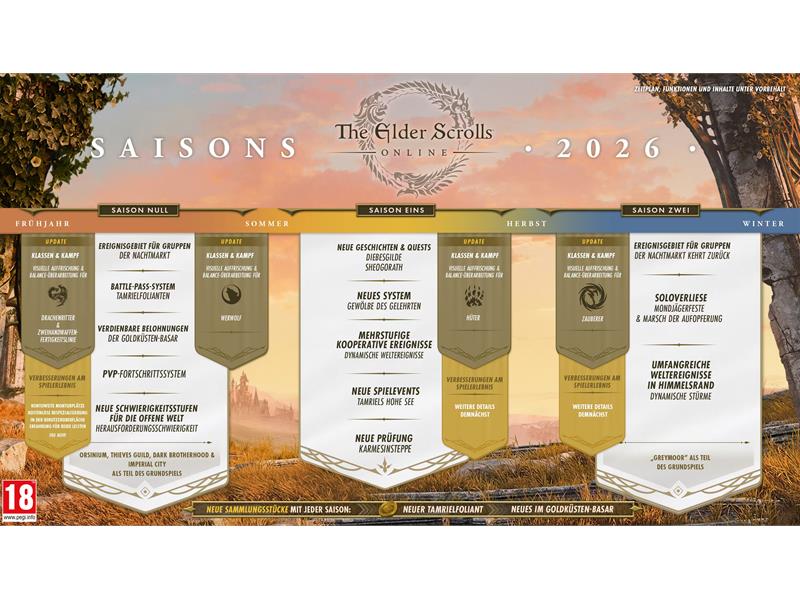 Saison Null legt den Grundstein für viele kommende ESO-Saisons und die aufregenden neuen Features, die sie mit sich bringen werden. Nachfolgend gibt es einen ersten Einblick in die geplanten Inhalte für die kommenden Saisons im Jahr 2026, darunter eine neue Questreihe der Diebesgilde, die Rückkehr von Sheogorath, eine neue Endgame-Prüfung, Solo-Verliese und ein brandneues Event auf hoher See. Die folgende Roadmap kann sich im Laufe der Entwicklung noch ändern.