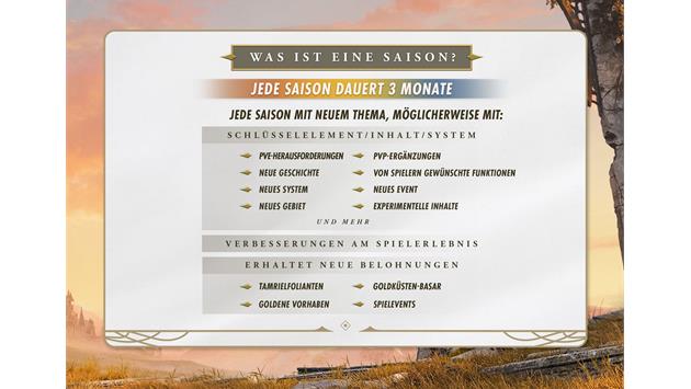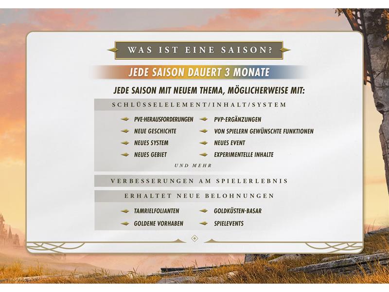 Während sich die Einzelheiten und der Umfang mit jeder neuen und eigenständigen Saison ändern wird, können Spieler jeweils eine Schar neuer Belohnungen, Abenteuer und Spielmöglichkeiten erwarten. Eine Saison kann alles Mögliche enthalten, von neuen Spielinhalten wie neuen Gebieten, Geschichten, Klassen, Fertigkeitslinien und Systemen, bis hin zu Spielerleichterungen und Verbesserungen der Leistung, komplett kostenlos für alle, die ESO besitzen. Tamrielfolianten verleihen jeder Saison ein neues, Battlepass-ähnliches Erlebnis mit kostenlosen Belohnungen und optionalen kostenpflichtigen Aufwertungsoptionen für diejenigen, die noch mehr wollen. Mehr Informationen zu [l2|Tamrielfolianten gibt es hier] und zu ESOs neuem Belohnungsshop im Spiel, dem [l3|Goldküsten-Basar, hier].