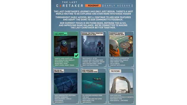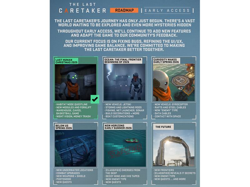 Update 01: Last Humans is the first of many updates planned for The Last Caretaker. The next update, Ocean: The Final Frontier, launches in early 2026 and features a Jetski, storms and lightning rods, a fishing and salvage update, along with boat customization. Check out the road map image to see the full schedule of updates.