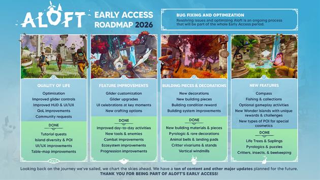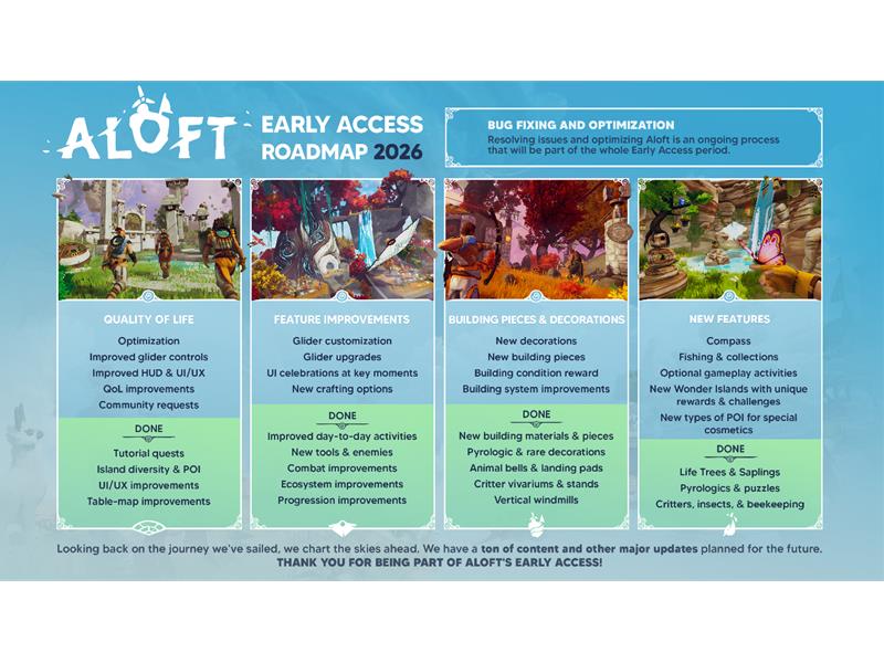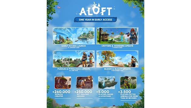 2025 war ein arbeitsreiches Jahr für das gemütliche, unterhaltsame Sandbox-Survival-Spiel, mit der Veröffentlichung von nicht weniger als drei Inhaltsupdates und zahlreichen Patches - alle beeinflusst durch das Feedback der leidenschaftlichen Community. Aloft erhielt zahlreiche Auszeichnungen, darunter „Best to Relax” bei den Gameoneer Awards 2025 und „Top 5 Best Studio Game” bei der Game Development World Championship sowie nicht weniger als acht Auszeichnungen bei den NYX Game Awards, darunter den Grand Prize für PC Game Indie, Survival, Casual und Best Experience.
