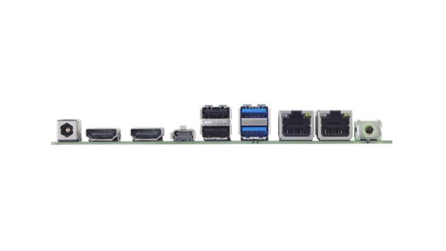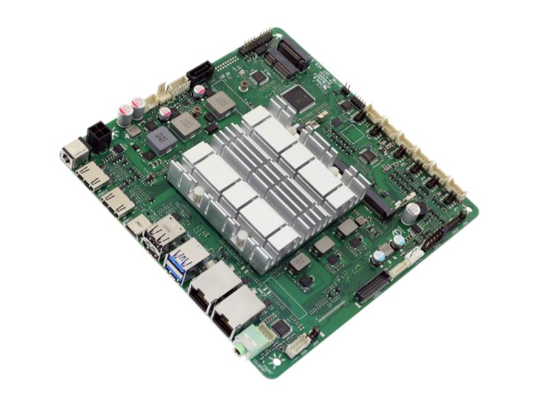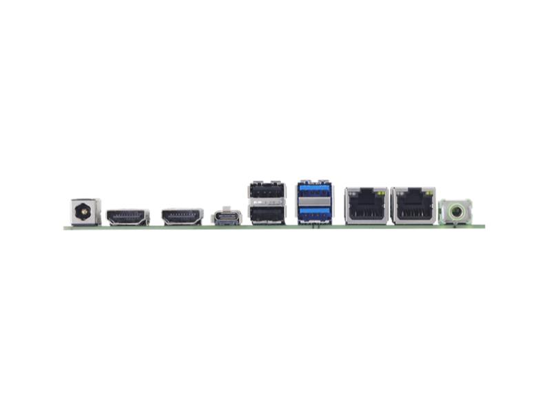 Comprehensive I/O support further enhances system integration. The rear panel includes dual HDMI®, USB-C with DP Alt Mode and 20V/5A Power Delivery sink support, USB 3.2 Gen1 and USB 2.0 ports, dual Gigabit LAN, audio output, and DC power input. Internally, the board provides LVDS and optional eDP headers with backlight and voltage selection, SATA connectivity, multiple USB headers, digital I/O, I2C interface, configurable COM power headers, and dedicated fan connectors. Wide-range DC-in support from 9V to 24V ensures stable operation across diverse industrial power environments, while USB-C PD support simplifies power integration for modern system designs.