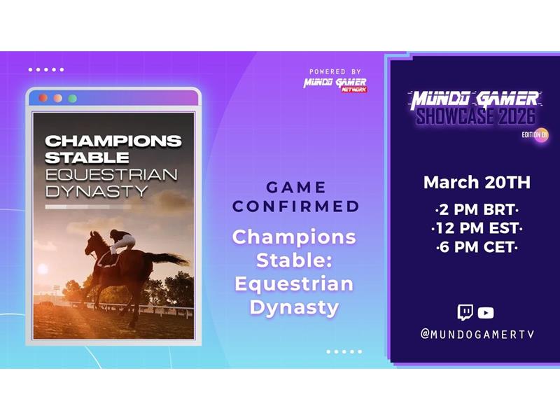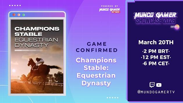 Die italienische Entwicklerin Leonardo Productions hat in Zusammenarbeit mit dem Publisher Leonardo Interactive ihre Teilnahme am Mundo Gamer Showcase 2026 - March 20 Edition bestätigt, der am 20. März um 14h BRT (13h ET / 10h PT / 18h CET / 17h GMT) stattfindet, mit Champions Stable: Equestrian Dynasty, einem Sportspiel, das Stallmanagement, Pferderennen und Open-World-Erkundung miteinander verbindet.