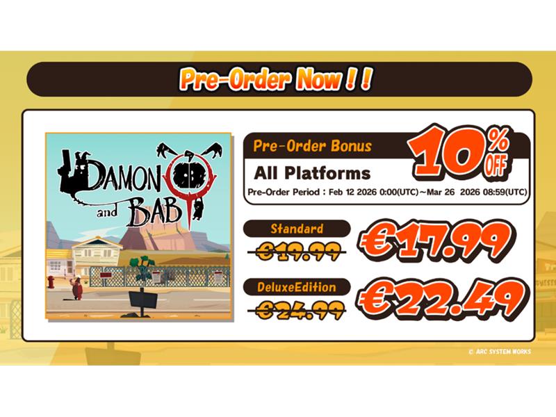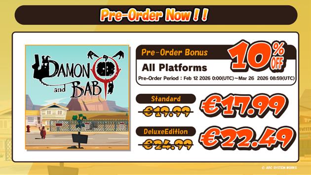 Arc System Works Co., Ltd. is pleased to announce that pre-orders are now open for the top-down gun action-adventure title DAMON and BABY on Nintendo Switch™, PlayStation®5, PlayStation®4, and Steam®, releasing on March 26, 2026.