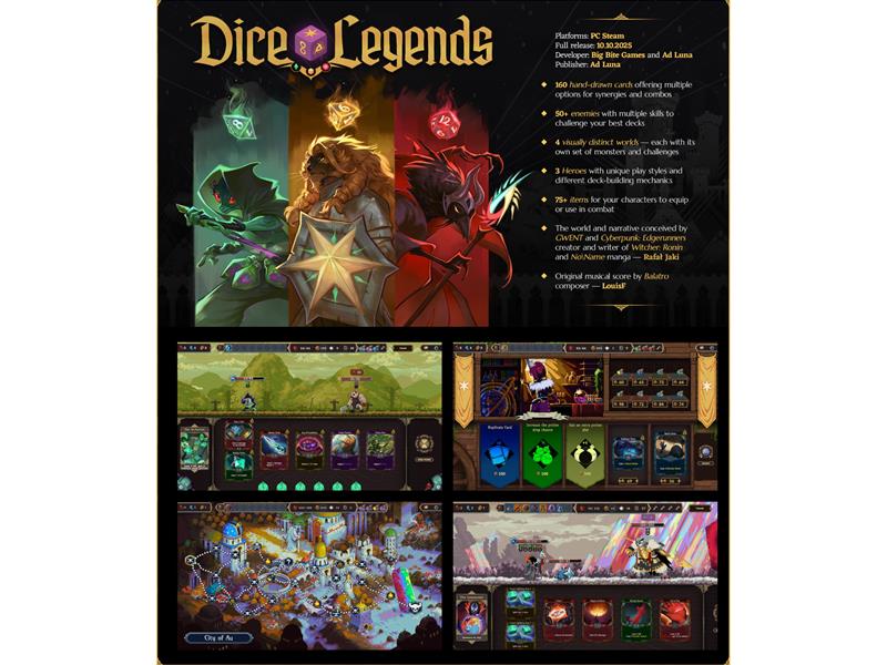 Developed by a small and ambitious indie team including Rafal Jaki - the creative behind Cyberpunk: Edgerunners and GWENT - Dice Legends is both a love letter to the deckbuilding genre popularized by Slay the Spire, and an attempt to further elevate it with fresh ideas and mechanics. The game features an upbeat original score created by Balatro’s music composer LouisF.