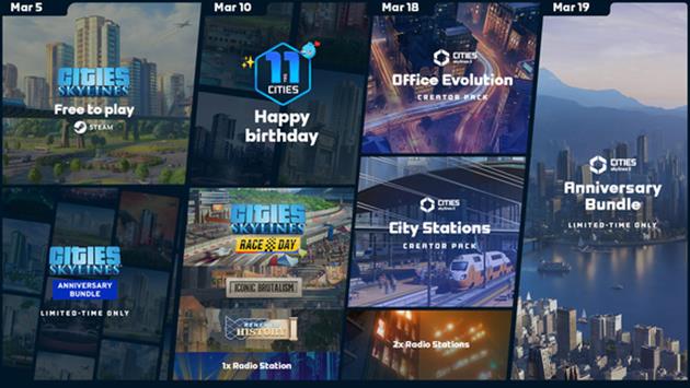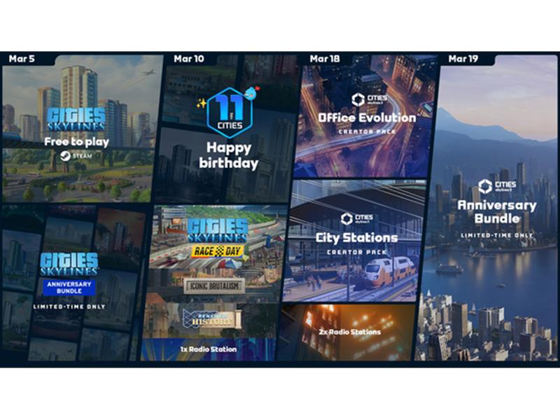 Am 18. März schließt sich Cities: Skylines II den Feierlichkeiten an und veröffentlicht zwei neue Creator Packs: Office Evolution und City Stations. Außerdem werden zwei neue Radiosender eingeführt: Smooth Vibes FM und Skyrail Radio. Nach dem ersten Patch, der im Februar vom Team von Iceflake Studios veröffentlicht wurde, wird ein spezieller Jubiläumspatch das charakteristische Gebäude "Iceflake Arena" ins Spiel bringen, die Zoneneinteilung verbessern und weitere Fehlerbehebungen sowie Neuerungen enthalten.