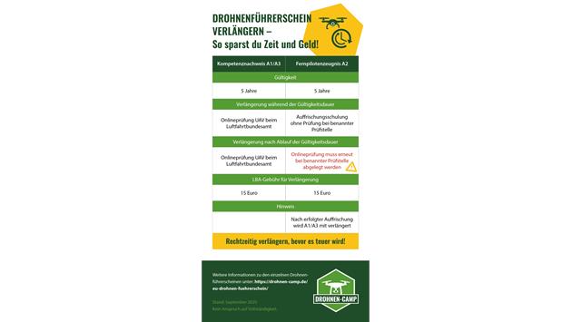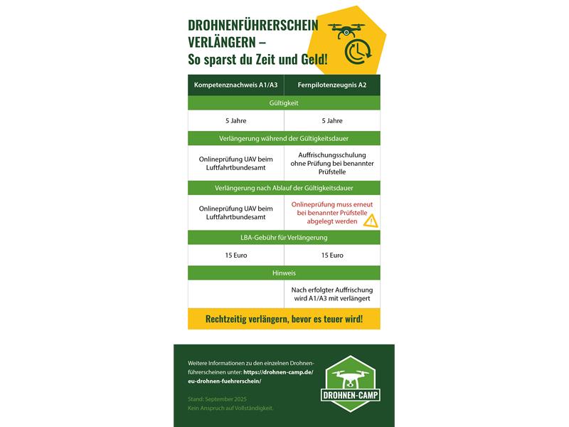 Wer sich frühzeitig um seine Verlängerung kümmert, spart nicht nur bares Geld, sondern vermeidet auch unnötigen Prüfungsstress. Die Infografik von Drohnen-Camp.de bietet dafür einen schnellen Überblick.
