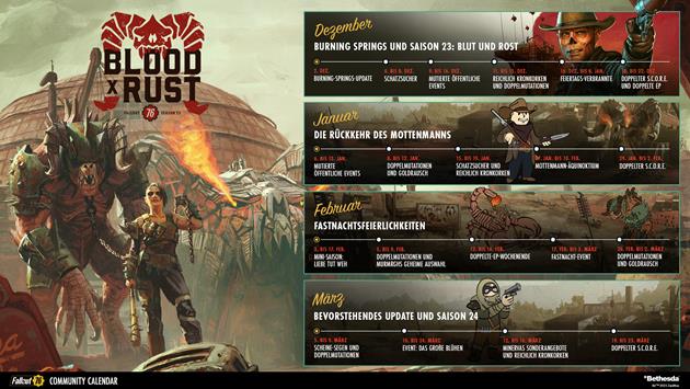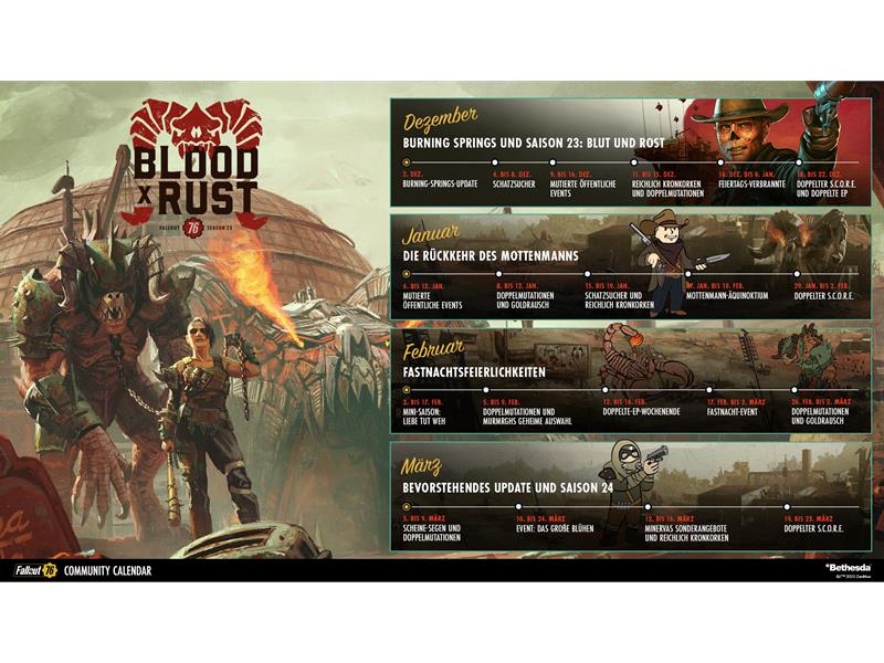 Das neueste Update Burning Springs ist seit dem 02. Dezember kostenlos für alle Spieler/-innen live! Sie reisen in das postnukleare Ohio und erkunden das neue Gebiet, inklusive Highway Town und dem Last Resort. Neu ist der Ghul aus der TV-Serie, der für Spieler/-innen Kopfgeldmissionen parat hat. In diesem Spiel kämpft man gegen die heimische Tierwelt, bestehend aus RAD-Keilern, Todeskrallen und vielem mehr! Dazu gibt es neue öffentlichen Events, Challenges und natürlich die Hauptmission, in der es der Rostkönig mit den Spieler/-innen zu zu tun bekommt.