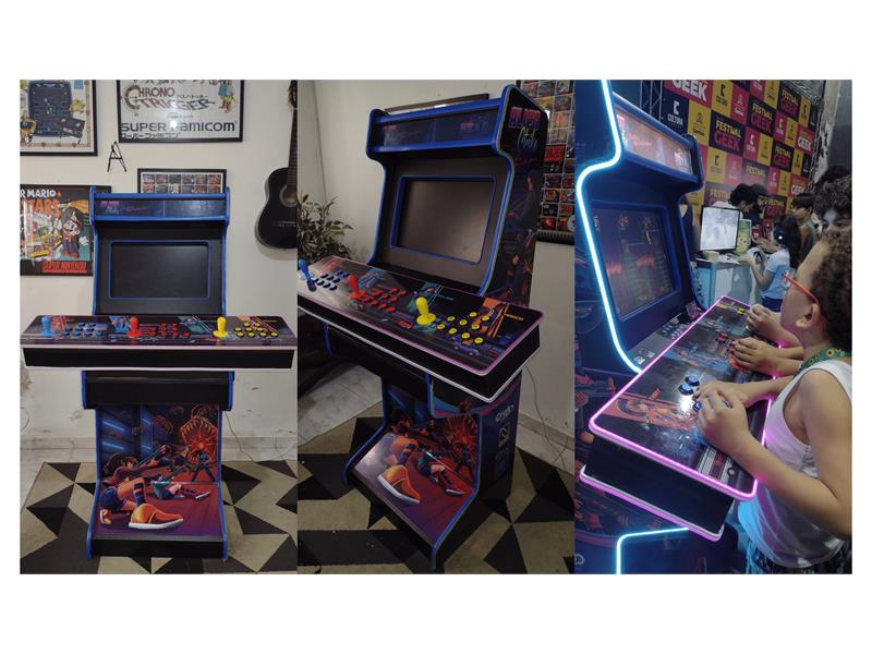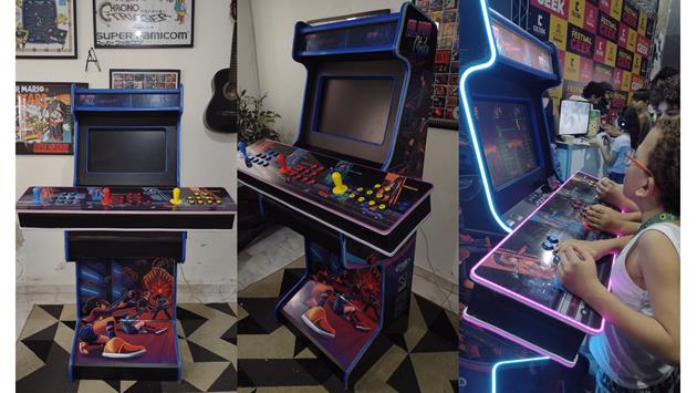 The structure was built using MDF, while the entire assembly process-including lighting, buttons, joysticks, and system-was handcrafted by the developer himself, using his previous experience with arcades.