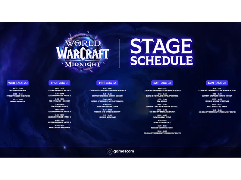 Von Mittwoch bis Sonntag gibt es auf der Community Stage des World of Warcraft-Stands ein durchgehendes Programm, unter anderem mit Entwicklervorträgen, Meet & Greets mit den Entwicklern, einem Cosplaywettbewerb, Creators im Rampenlicht, eSports-Turnieren und interaktiven Veranstaltungen für die anwesende Community und für Spieler/-innen, die virtuell über die sozialen Kanäle von World of Warcraft zuschauen.