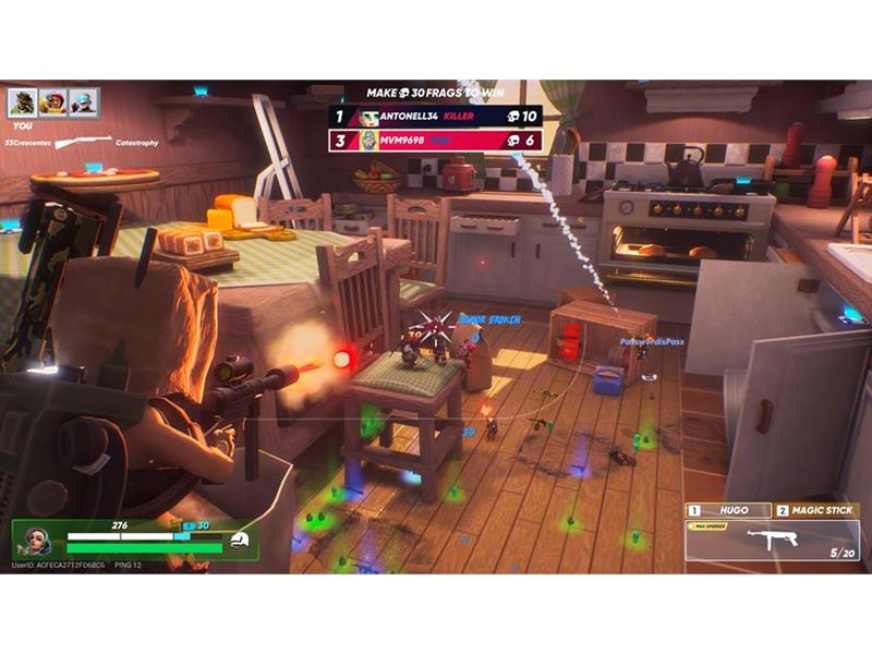While PvP is the meat and potatoes of Bullet Yeeters, those wanting a friendlier time can sign a temporary truce to tussle with some spectacular boss enemies. Oversized toys and nanobot monstrosities rampaging through the house like miniature kaiju, and you’re just the jetpacking miniature commando squad to take them down. Claim your prizes, equip your characters and customize them to your heart’s content, then return to the battleground with maximum swag. You might not be the tallest of heroes, but you’ve got big drip.
