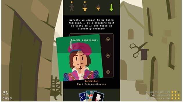 With a first look at gameplay revealed in the Reigns: The Witcher Reveal Trailer, players swipe left or right to determine Geralt’s actions: advise a villager against hunting a beast, or humor them at the risk of their own life? Few choices will have clear consequences, and players must choose wisely to keep the story - and Geralt - alive.