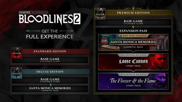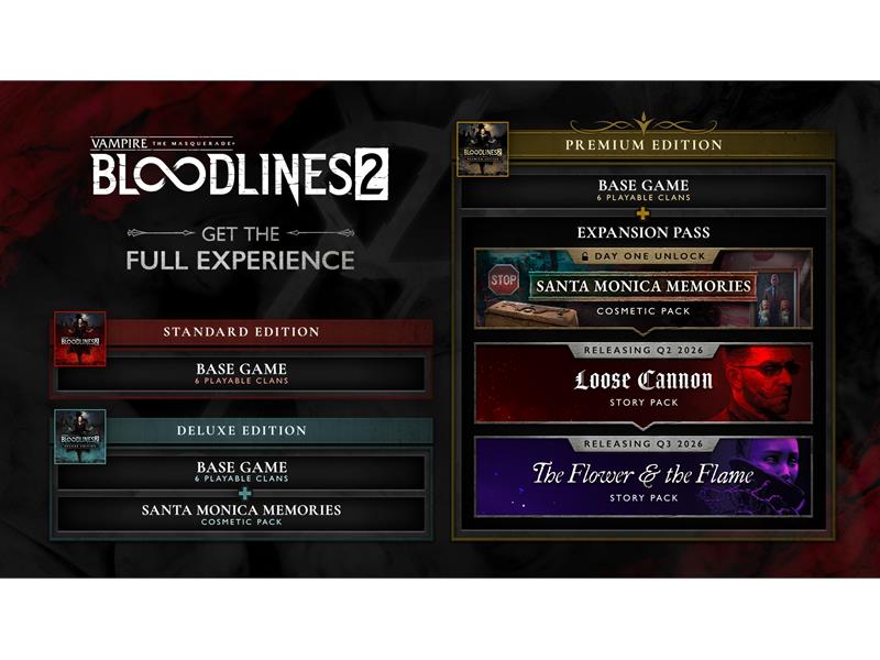 Vampire: The Masquerade - Bloodlines 2 - Loose Cannon and Vampire: The Masquerade - Bloodlines 2 - The Flower & the Flame story packs will launch in 2026 and are available in the Expansion Pass. These Story Packs allow players to explore Seattle through the perspectives of Sheriff Benny Muldoon and Primogen Ysabella Moore, respectively.