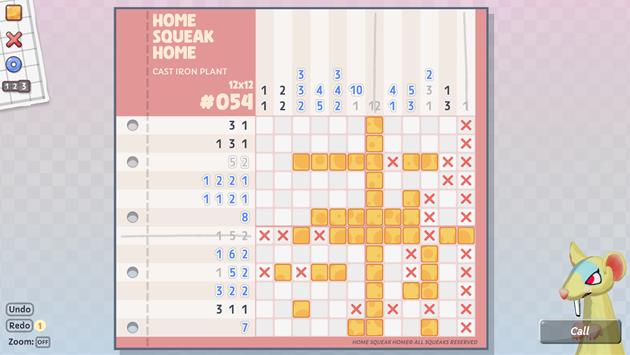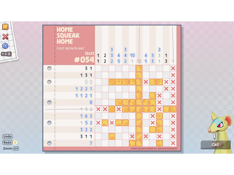 Welcome to the Home Squeak Home program! In this program, you will meet Nini, the program’s official Manager, who has a passion for nonogram puzzles. Nini has provided you with a cozy rat residence, but there's just one condition: you must solve Squeakross puzzles to earn furniture and fill your empty home! Your puzzle catalog contains 650 solvable Squeakross puzzles. Each completed puzzle will reward you with furniture for your rodent residence. The hint numbers on the sides indicate how many squares to fill with cheese in each row or column. Mark the largest hint numbers, leaving spaces as needed. Then, analyze different arrangements to complete the puzzle. Strike out hint lines one by one and repeat the process until the picture of your brand-new furniture is revealed!