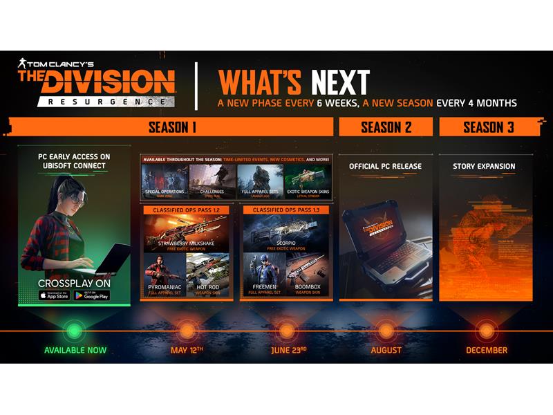Alle vier Monate erwartet die Spieler/-innen eine neue The Division Resurgence Season, spielbar auf iOS, Android und jetzt auch PC. Die nächste Phase von Season 1 beginnt am 12. Mai und bringt spannende und herausfordernde neue Inhalte. Dazu gehören zeitlich begrenzte Events, wie Dark Zone oder Speed Run Challenges, aber auch neue, kosmetische Sets, wie Camouflage oder ausgefallene Waffen-Skins.