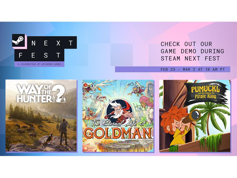 Im Rahmen des Steam Next Fest (23. Februar - 2. März) können Spielerinnen und Spieler ab sofort Demos zu drei kommenden THQ Nordic Titeln ausprobieren. Erlebt den handgezeichneten Plattformer The Eternal Life of Goldman, das Open World Jagdspiel Way of the Hunter 2 sowie das familienfreundliche Piratenabenteuer Pumuckl und die Krone des Piratenkönigs.