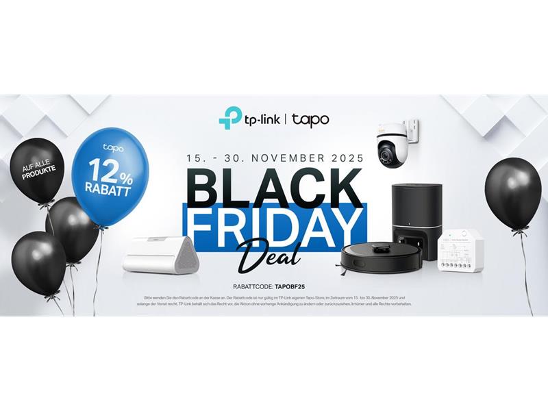 Vom 15. bis 30. November 2025 läuft im Tapo Store die große Black-Week-Aktion. Während dieses Zeitraums erhalten Kunden mit dem Code TAPOBF25 12 % Rabatt auf das gesamte verfügbare Portfolio - von Sicherheitskameras über Thermostate bis hin zu Steckdosen, Sensoren und Beleuchtungslösungen. Die Rabattaktion ist der perfekte Zeitpunkt, um das eigene Zuhause zu einem smart Home aufzurüsten. Zu den interessantesten Produkten, die es im Rahmen der Black Week zu attraktiven Preisen geben wird, gehören zum Beispiel:
